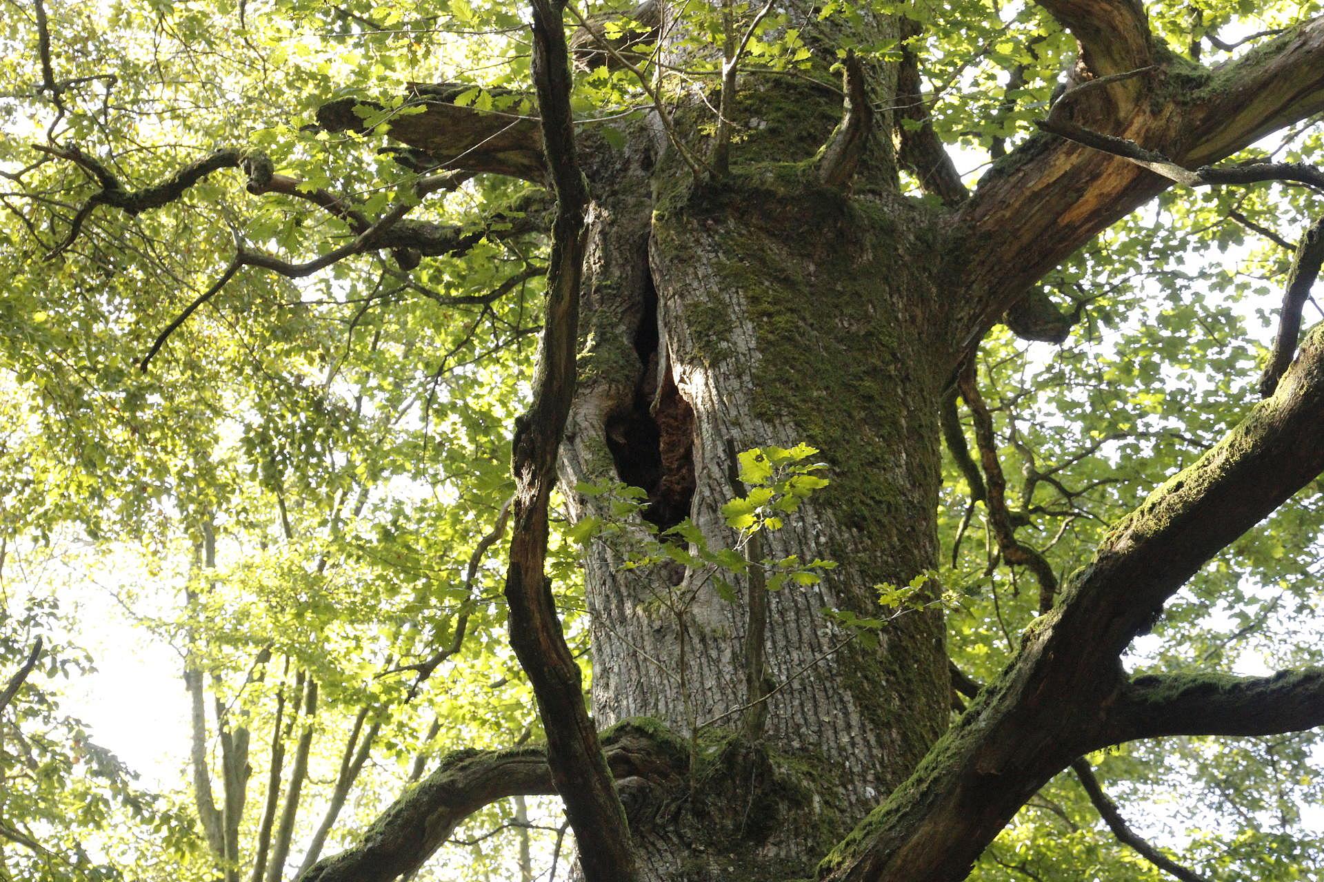 Biotopbäume sind Bäume, die besondere Merkmale wie Höhlen, Spalten und abgebrochene Äste aufweisen. Liegt der Holzkörper erst mal offen, führen Feuchtigkeit, Bakterien und Pilze dazu, dass das Holz langsam fault und sich weitere kleine Nischen bilden. Diese Strukturen sind für viele Lebewesen sehr wichtig. Sie bieten Brutplätze für Specht, Hohltaube und viele andere Vögel. In Rindenspalten schlafen tagsüber Fledermäuse. In dem Holz, das sich gerade zersetzt, wimmelt es nur so von Insekten, die sich der Specht schmecken lässt! Auch seltene Pilze finden an Biotopbäumen ein wertvolles Habitat.