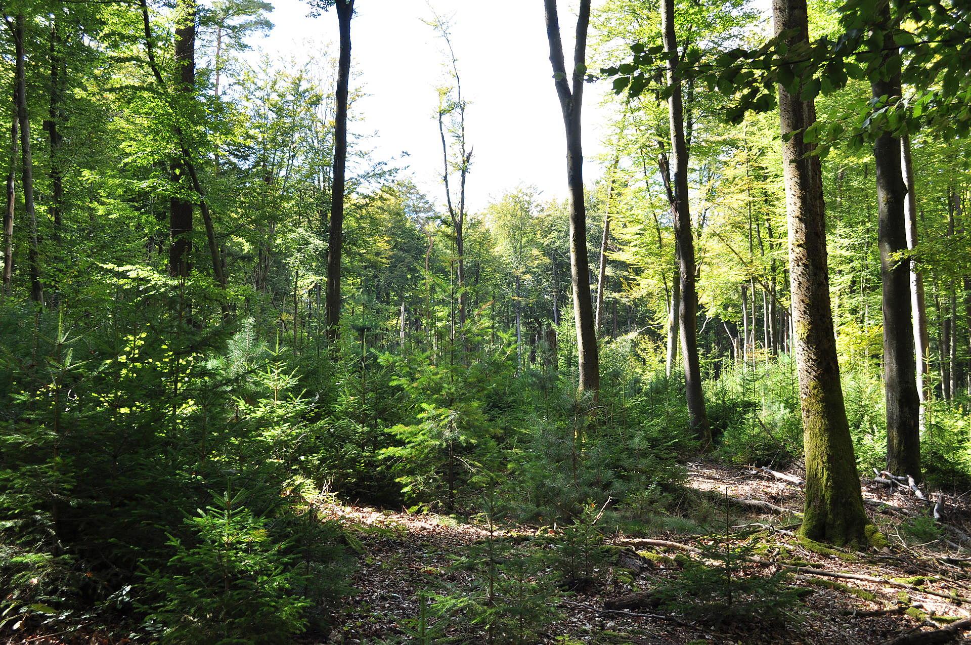 Hier ist es unser Ziel den Anteil der Buche, sowohl im Altbestand als auch in der Verjüngung zu steigern. Die Nadelhölzer gehören jedoch auch in die nächste Waldgeneration, denn wir wollen weiterhin vier Baumarten auf einer Fläche haben, um klimastabile Wälder zu schaffen und zu erhalten. In Lichtkegeln können sich Fichte, Kiefer und Lärche gut verjüngen, während die Buche sich in den dunkleren Bereichen ansamt. Die Lichtverhältnisse steuert der Förster, indem er festlegt, welche Bäume geerntet werden und welche stehen bleiben. Außerdem markiert er Biotopbäume und belässt Totholz, um auf gesamter Fläche Lebensräume für typische Waldarten zu sichern. So soll der Wald immer naturnaher werden.